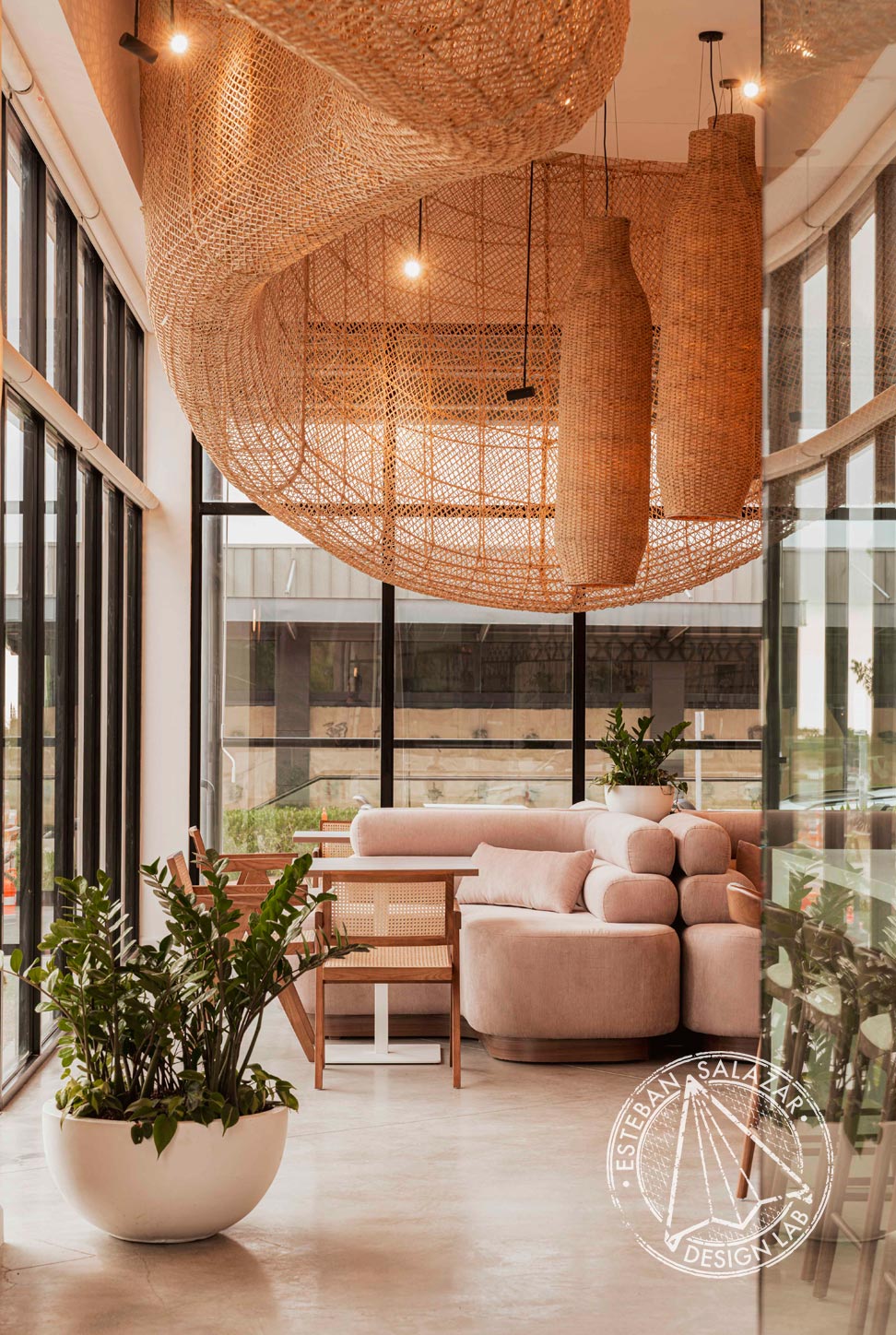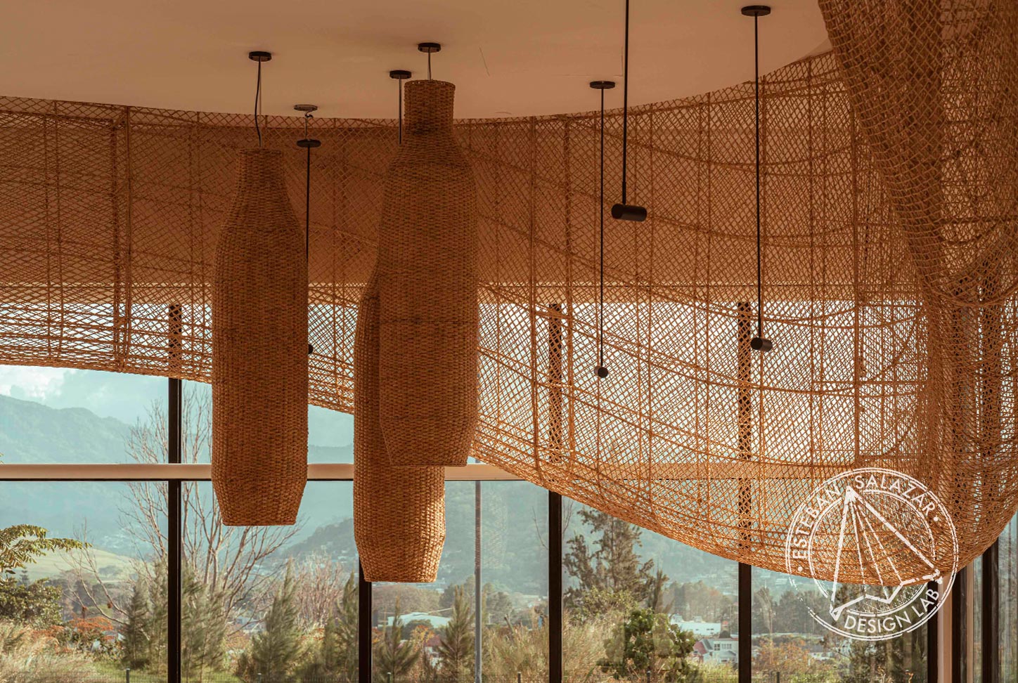 At the heart of Búlali floats a breathtaking, 22-meter-long suspended sculpture: meticulously handcrafted from over 200 kilograms of Cabuya fiber, interlaced around a parametrically designed steel frame. Like a whispered ode to the honeycomb, it drifts ethereally above. Over four months, local artisans infused the piece with care and tradition, merging cutting-edge technology with the irreplaceable touch of the human hand. The result is more than a design object — it is a testament to the magic born when art, architecture, and craft unite.